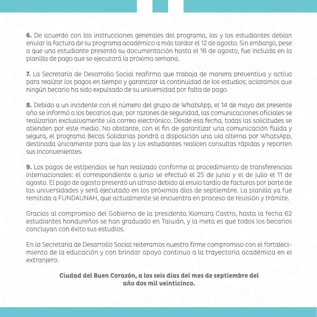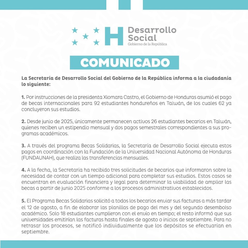 - A través del programa Becas Solidarias, la Secretaría de Desarrollo Social ejecuta estos pagos en coordinación con la Fundación de la Universidad Nacional Autónoma de Honduras (FUNDAUNAH), que realiza las transferencias mensuales.