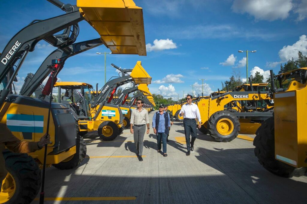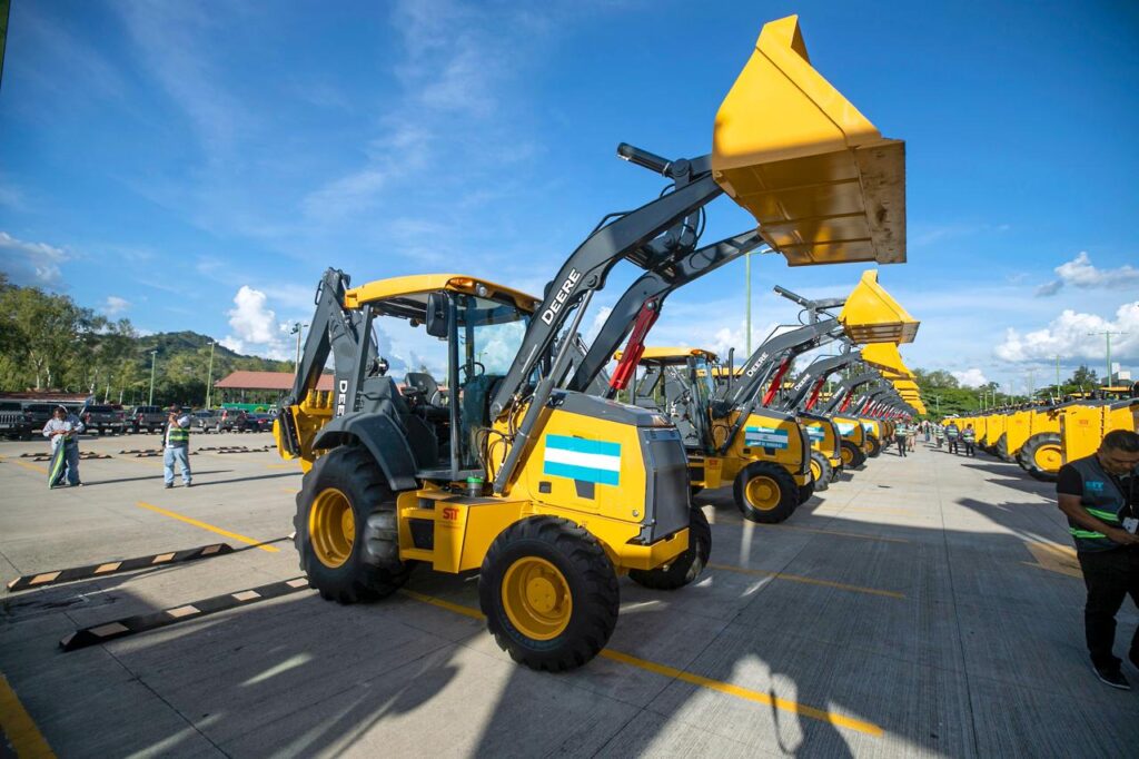 La titular del Ejecutivo entregó a la SIT- que trabajará en coordinación con el Fondo Hondureño de Inversión Social (FHIS)- 23 motoniveladoras, 23 retroexcavadoras, 23 vibro-compactadoras, 8 excavadoras y 10 volquetas para un total de 87 máquinas.